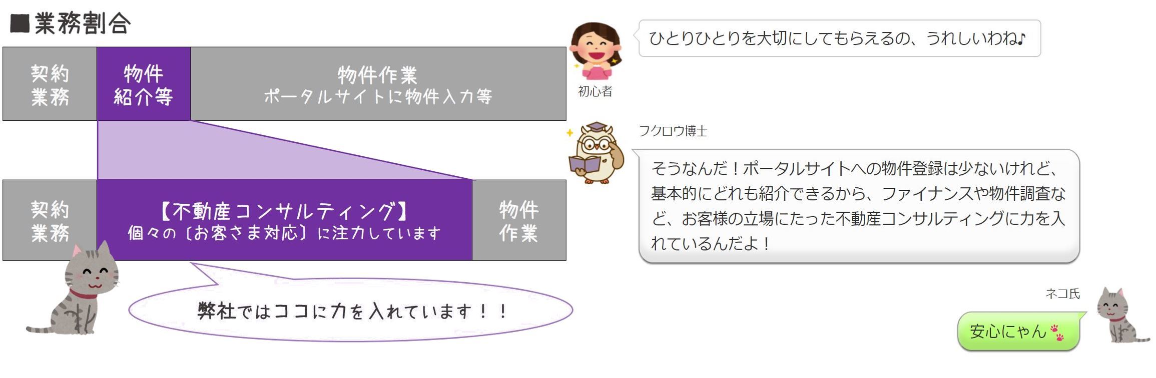 しかし、弊社では、『心からお客さまがご満足される為に』と考えたとき、「お客さま自身の為の時間をたくさん使えることがベストではないか」と【不動産コンサルティング】の時間を主にしております。(■業務割合のグラフ下)